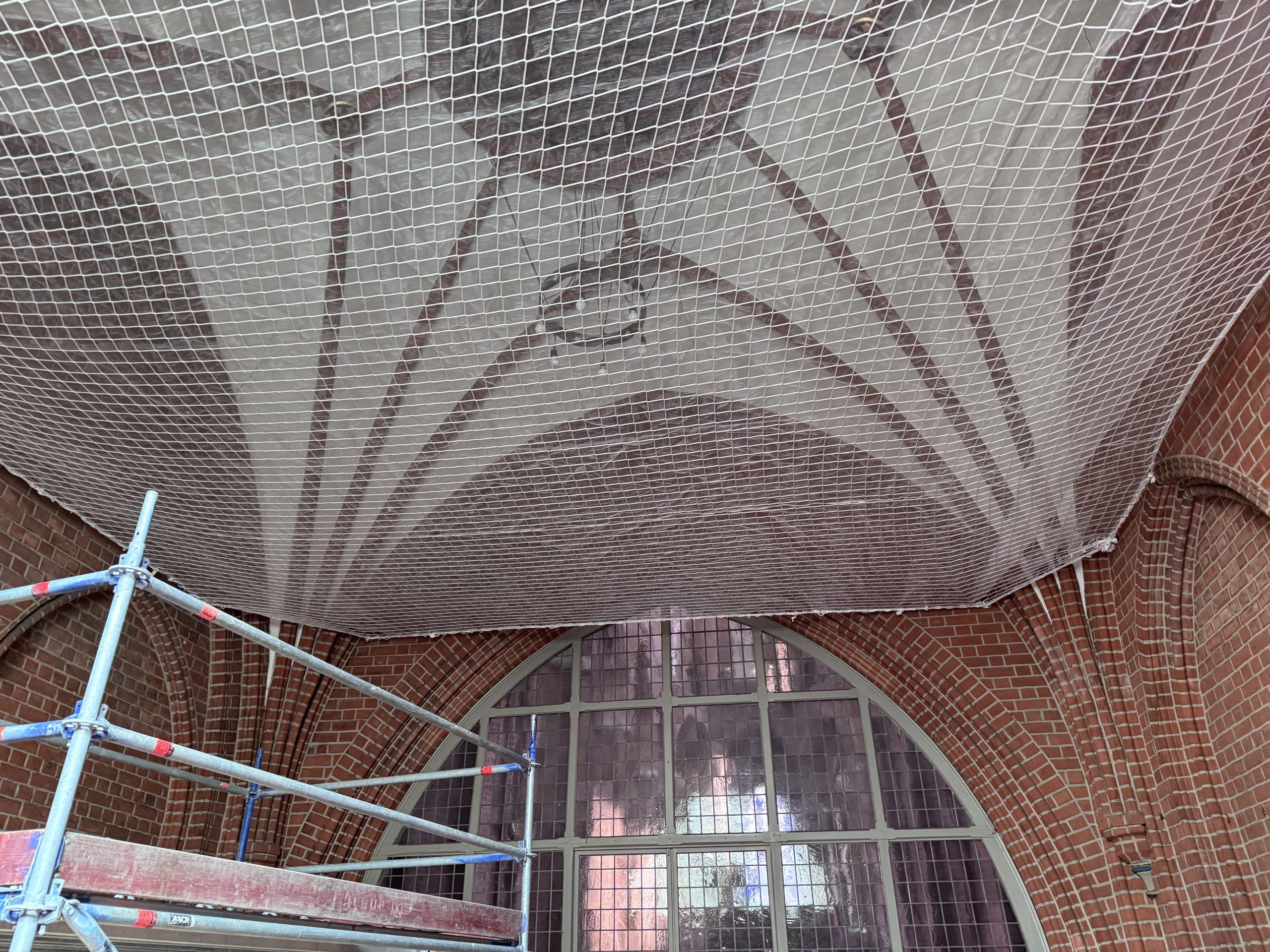 Primera instalación de red de protección con malla mosquitera para proteger el techo de una iglesia en Alemania.